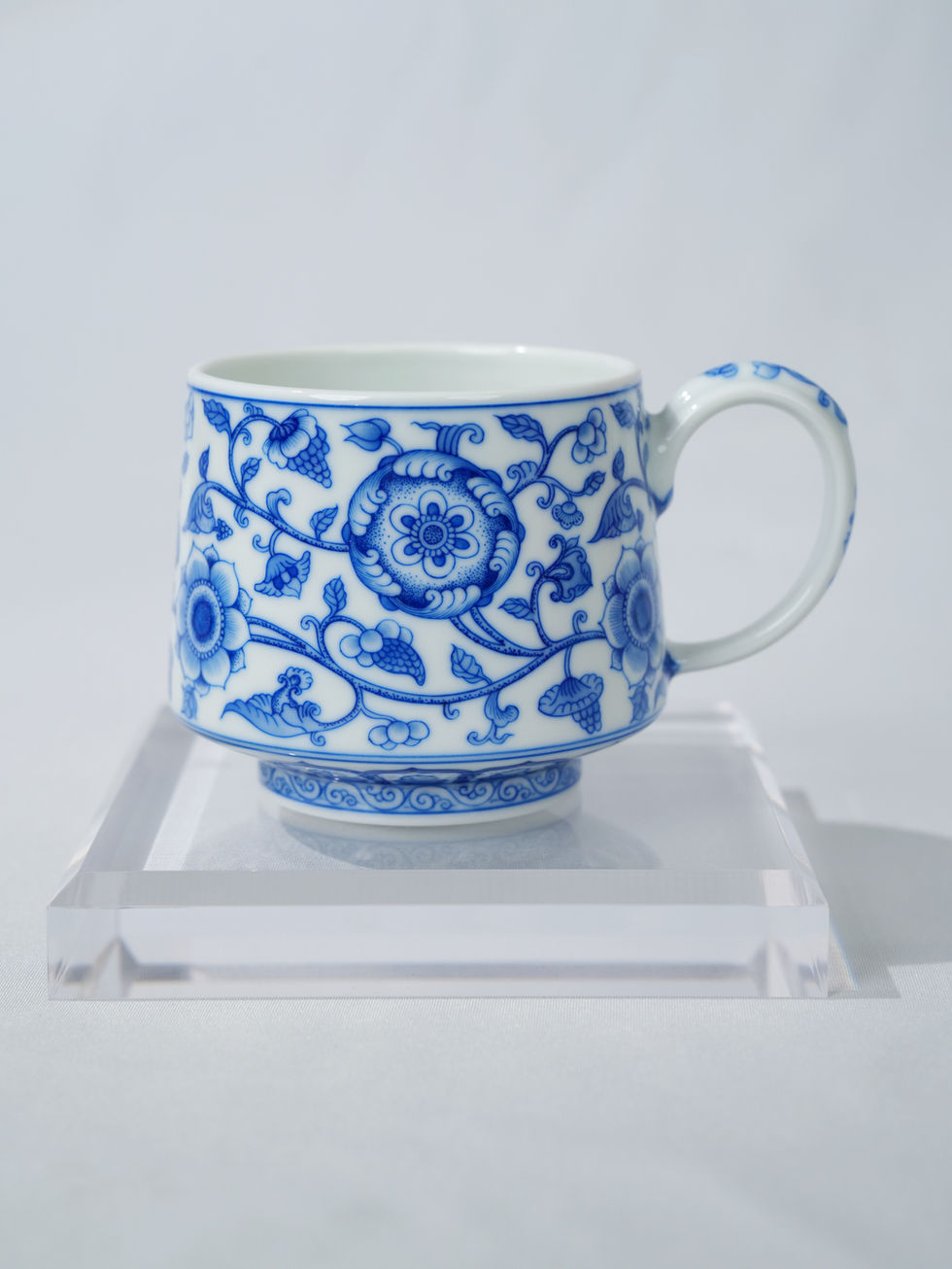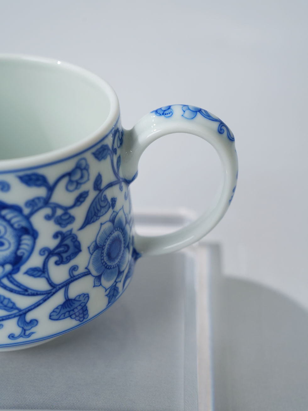- Round Saucer: Classic round saucer (Ø15cm × H2cm) with recessed center for stable cup placement, mirroring the cup’s intricate blue and white floral scroll and grape decoration, with ornate scrollwork border