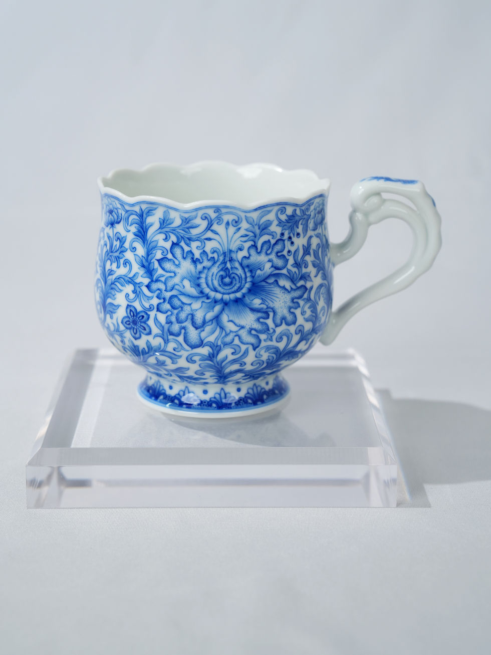 - Lobed Rim Saucer: Matching scalloped-rim (Kui-kou) saucer (Ø15cm × H2.5cm) with recessed center for stable cup placement, mirroring the cup’s intricate blue and white floral scroll decoration
